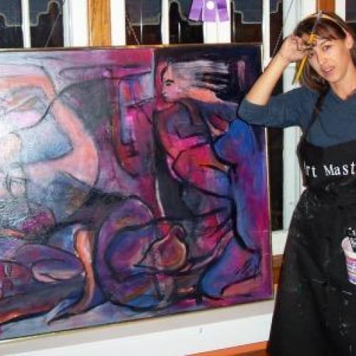 Bold form and strong colours are the mark of her style. She has built on her influences: the colours of the Fauves, the abstraction of Picasso, and the simplicity of Matisse. A trip to Europe with visits to seven major museums and galleries has laid the groundwork for further exciting explorations in her work; including working on large scale canvases. Subject matter ranges from Northern landscapes, to floral still life, abstracts and figurative imagery.